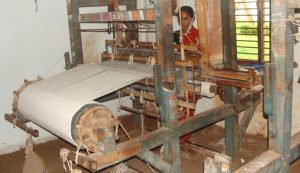 Weavers set up warps on pit or frame looms and weave the khadi fabric. The handloom’s rhythm, the shuttle’s beat and the weaver’s eye for tension produce a fabric that is intentionally uneven; the hallmark of authentic khadi. - Finishing: